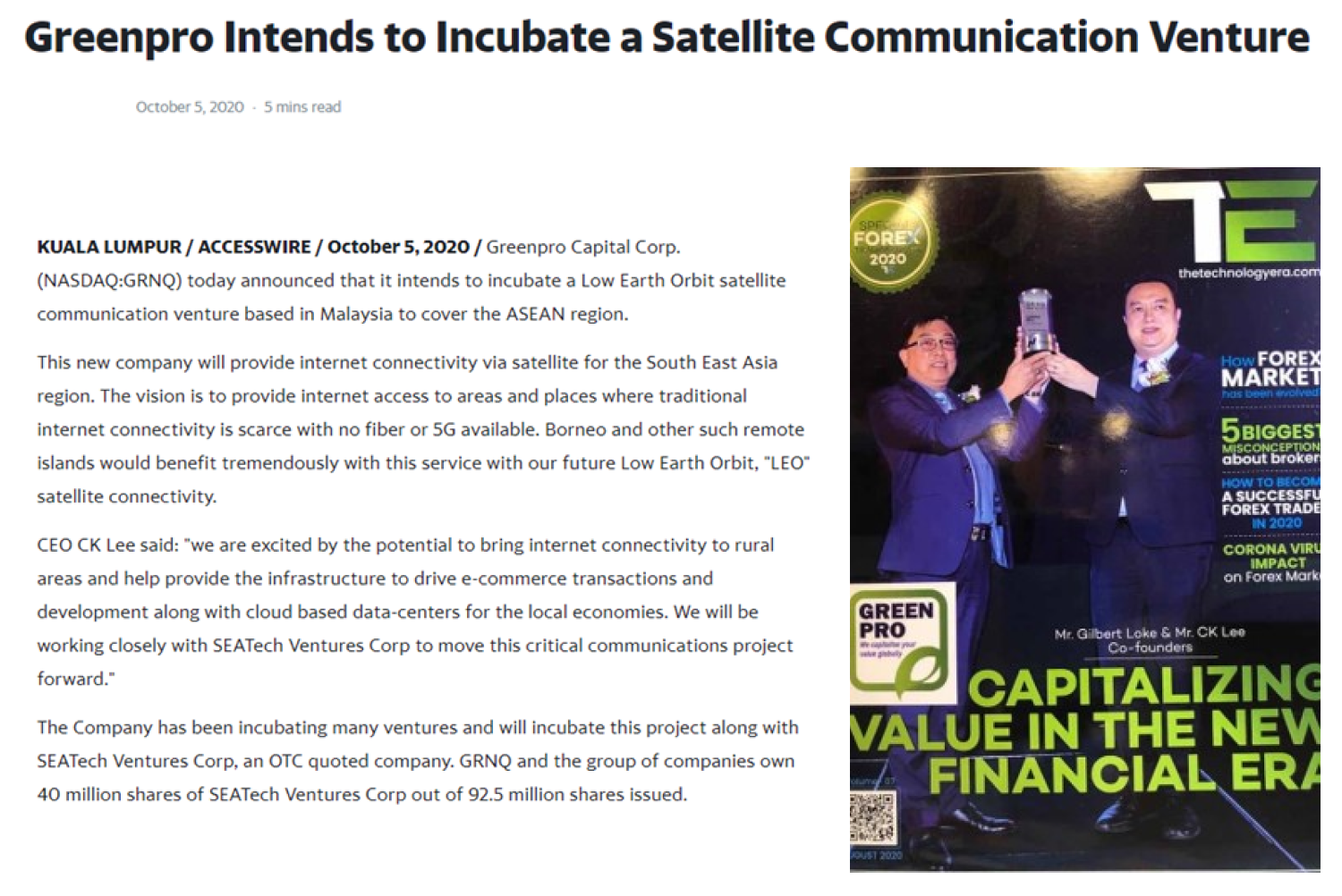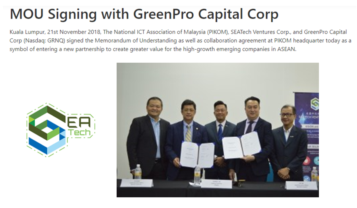 Headquartered in Kuala Lumpur, Malaysia, Greenpro Capital Corp. (NASDAQ:GRNQ) (a Nevada corporation) with strategic offices across Asia, is a business incubator with a diversified business portfolio comprising finance, technology, banking, CryptoSX, a licensed crypto exchange for Securitized Token Offerings "STO's", health and wellness and fine art.